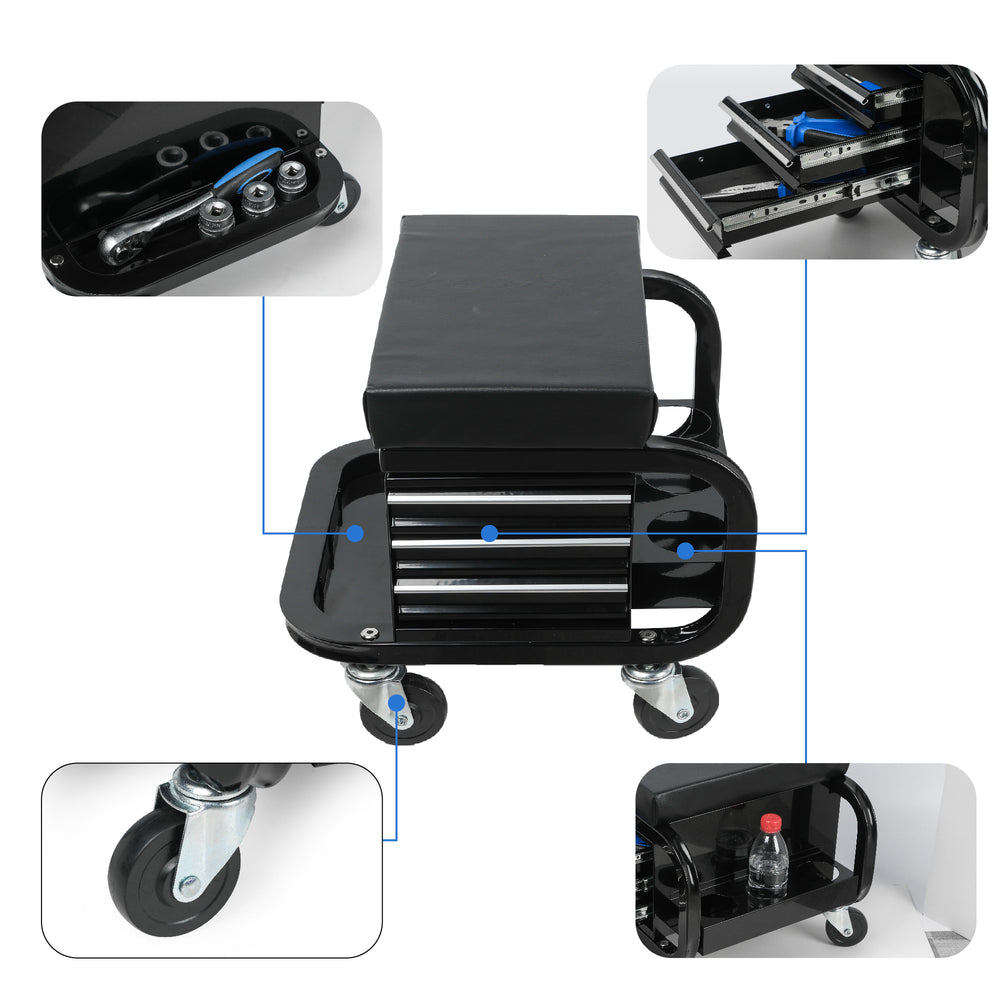 - The multifunctional rolling stool with three built-in drawers.Ball bearing slides on both drawers,so you can You can easily access the tools.