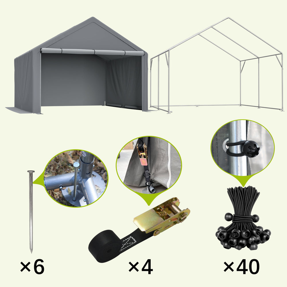 - 【Heavy-Duty Shelter for Easy Access】Built with a robust galvanized steel frame and a reinforced triangular structure for exceptional stability. This shelter features a spacious, easy-roll door that offers full-height access, ideal for storing vehicles, boats, or as an outdoor event space. Complete protection is ensured by the durable, UV-coated 180G PE fabric, which resists rain, snow, and sun damage.