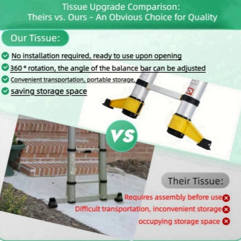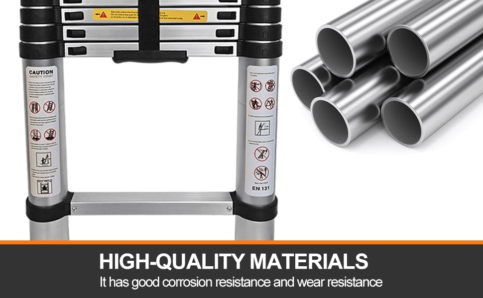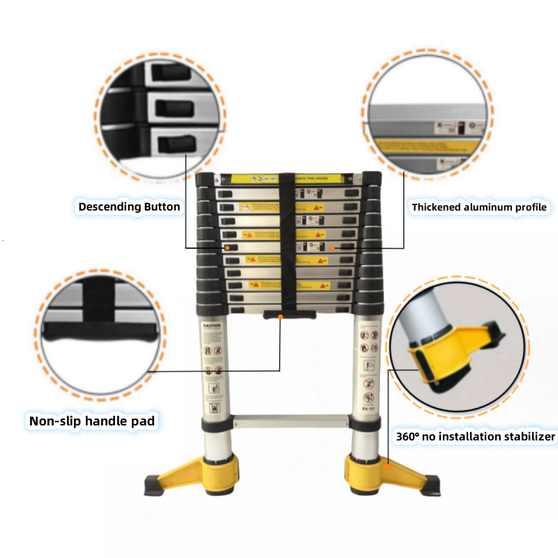 - [Safe and Reliable] Anti slip telescopic ladder has stripes on each pedal to increase friction. The stable locking safety pedal can prevent collisions and drops, and high-quality anti slip rubber feet can easily fix the telescopic ladder to the floor. Equipped with a 360 ° rotatable stabilizer bar for increased stability and safer use. It is also equipped with magnetic strips for attaching hardware tools, making it more convenient to use.