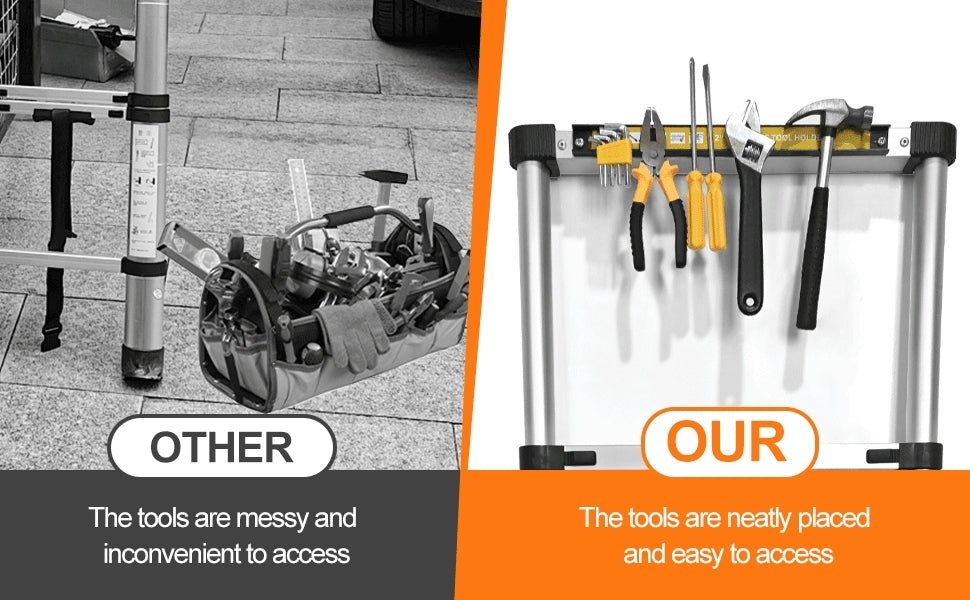 - [Safe and Reliable] Anti slip telescopic ladder has stripes on each pedal to increase friction. The stable locking safety pedal can prevent collisions and drops, and high-quality anti slip rubber feet can easily fix the telescopic ladder to the floor. Equipped with a 360 ° rotatable stabilizer bar for increased stability and safer use. It is also equipped with magnetic strips for attaching hardware tools, making it more convenient to use.