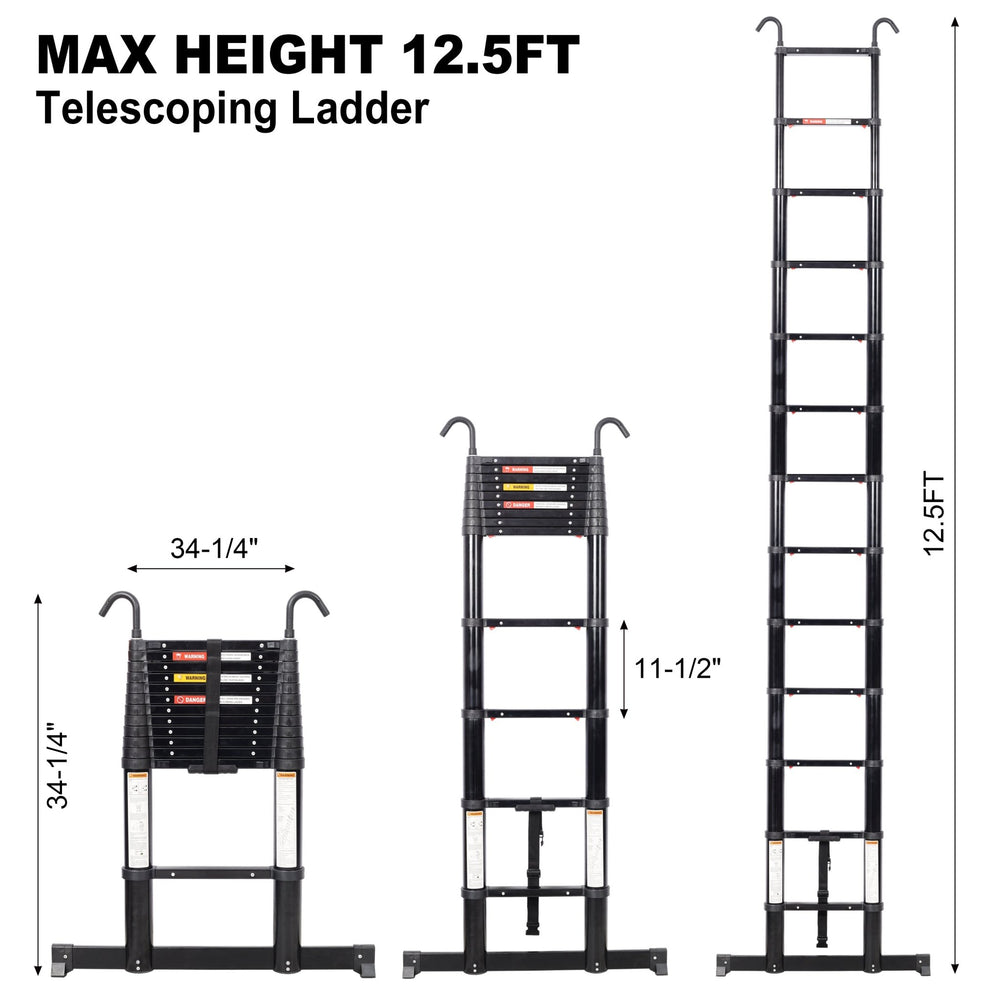 - Max extendable length 12.5FT. Foldable size only 34"x3.5"x34.6", easy to carry. With an adjustable length ranging from 3.6FT to 12.5FT, this Aluminum telescoping ladder adapts to low and high tasks with ease.