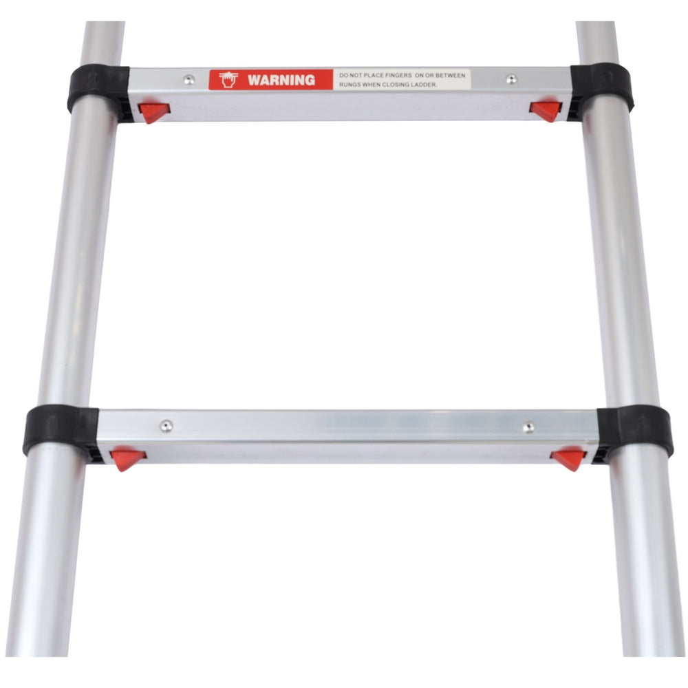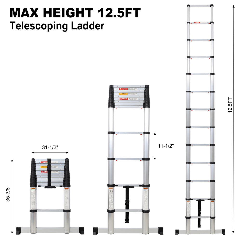 - Max extendable length 12.5FT. Foldable size only 34"x3.5"x34.6", easy to carry. With an adjustable length ranging from 3.6FT to 12.5FT, this Aluminum telescoping ladder adapts to low and high tasks with ease.
