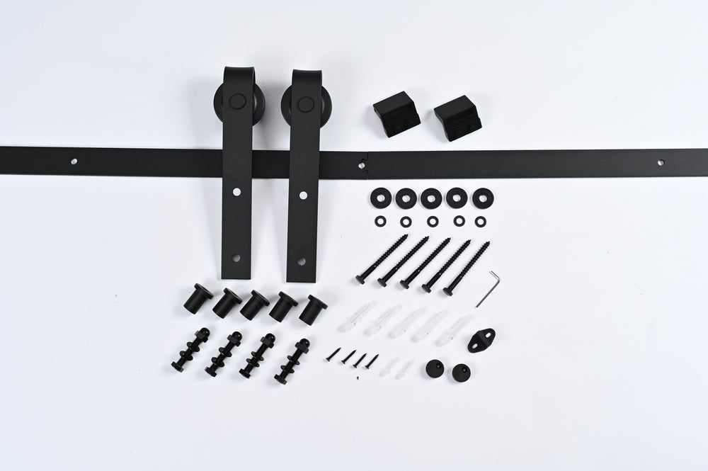 - [ALL MOUNTING HARDWARE INCLUDED] - Kit comes with all necessary hardware for hanging the door, including 2 piece 4FT sliding tracks,1-junction plate, 4-door stoppers, 4-wall hangers with rollers, 2-floor guide, 4-anti-jump disks, 6 M10 bolts and spacers, 8 M10 60 bolts for 1-3/8" to 1 3/4" doors , instructions. TRACK AND HARDWARE ONLY, DOOR NOT INCLUDED.