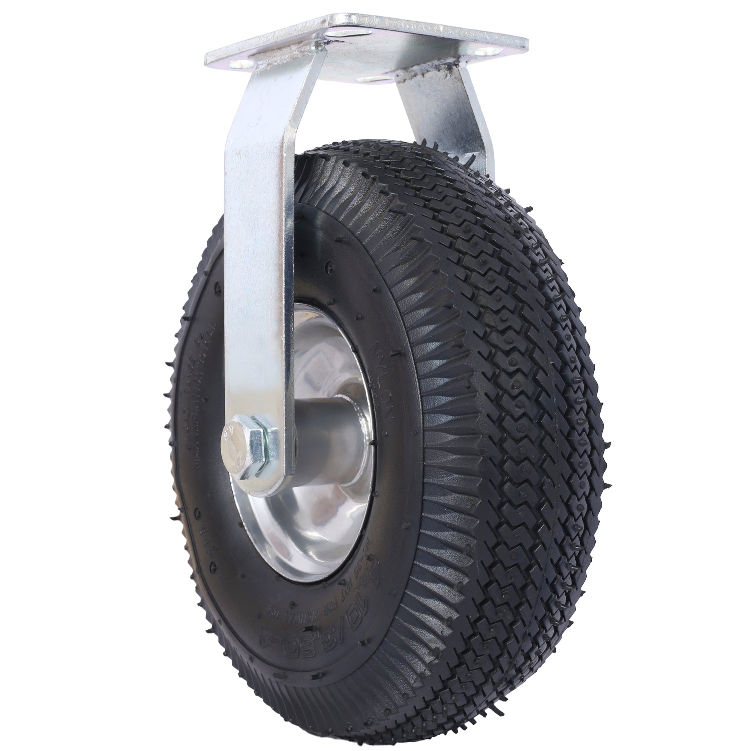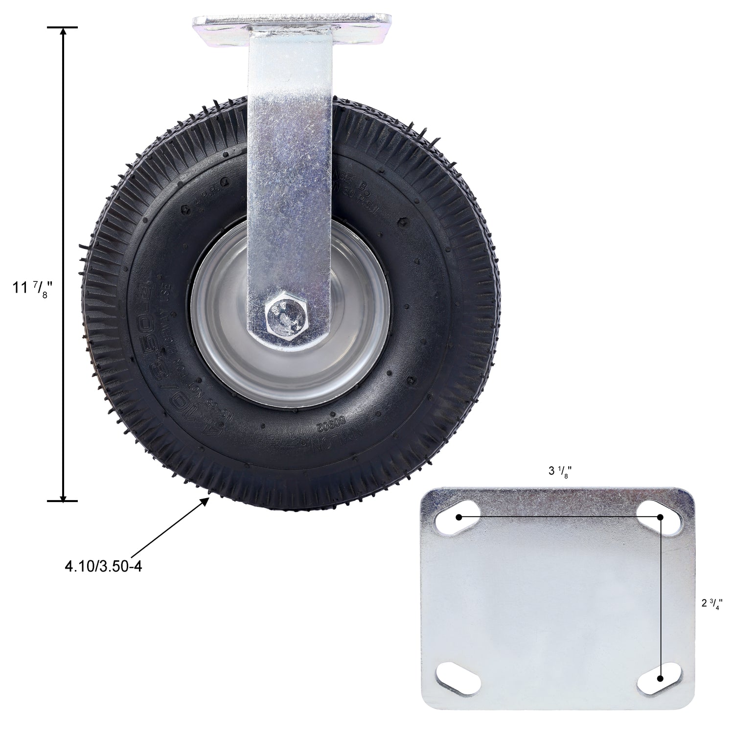 10" Large Pneumatic Tire Set, Tires Read: 3.50-4 5/8-Inch Bore Centered Axle Includes: 2 Swivel Casters and 2 Fixed Casters Caster Plate Center Hole to Center Hole Dimensions: 3 1/8" x 2 3/4" Individual Tire Support Weight Rating at 300 Pounds