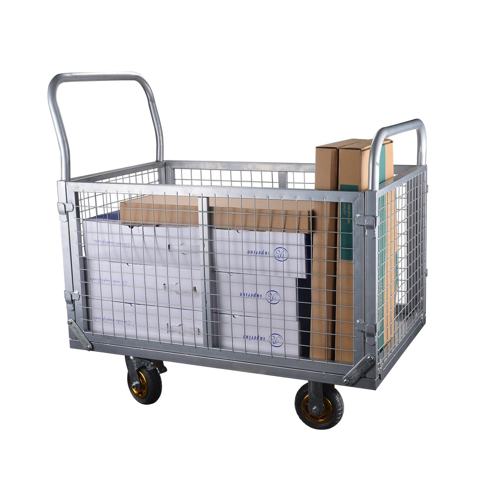 - 【6-in-1 Design】The folding cage with cart is a versatile and durable multi-function utility cart, that has a removable cage on both sides, allowing you to transport larger items easily. Its 6in1 design offers flexible usage as a cage cart, platform truck, stall cart, 2 shelf cart ,3-side fence cart or U-boat truck. Its spacious interior makes it designed specifically for transporting goods, supplies, materials, laundry, and storage applications