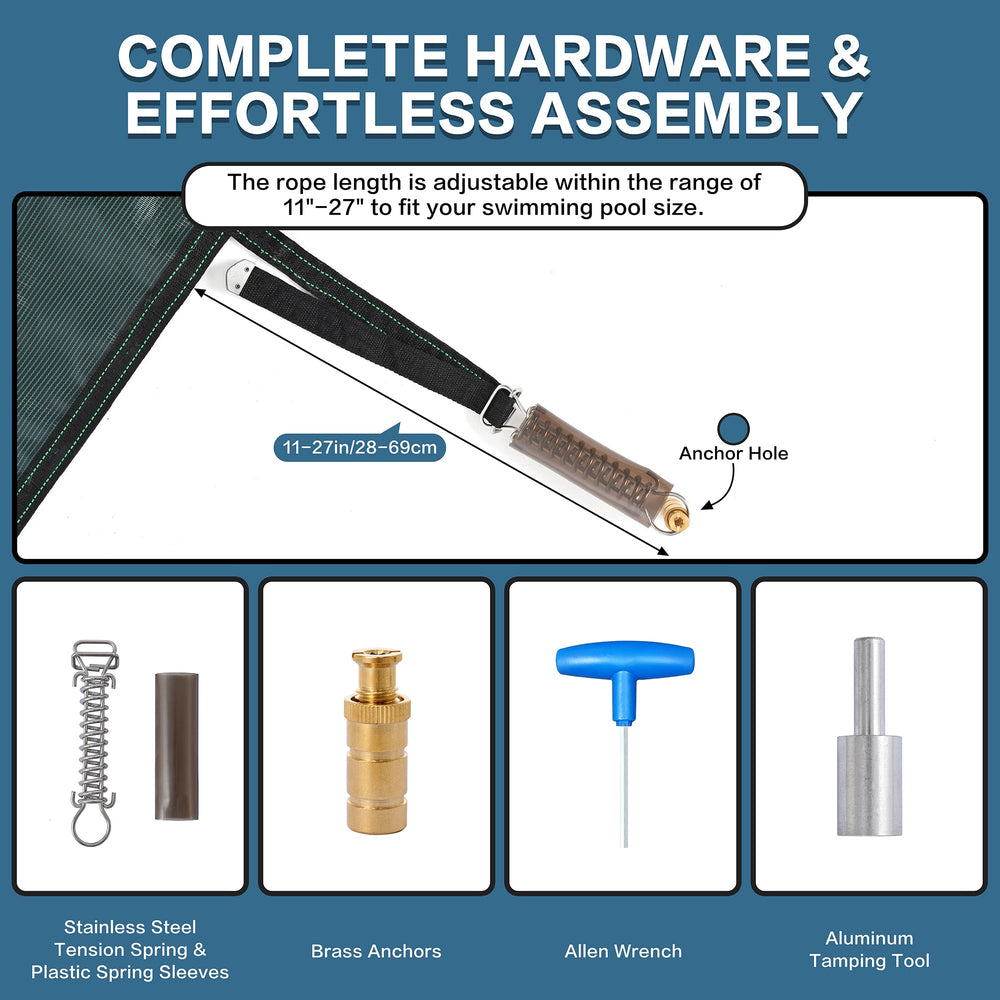 - All accessories are ready to use out of the box: This kit includes brass anchor bolts, stainless steel springs and all necessary installation tools. Compatible with hard pool banks such as concrete and stone, adjustable rope length, suitable for 90% of underground swimming pool structures. The three-step installation method of 'measurement - drilling - tensioning' can be completed by a single person.