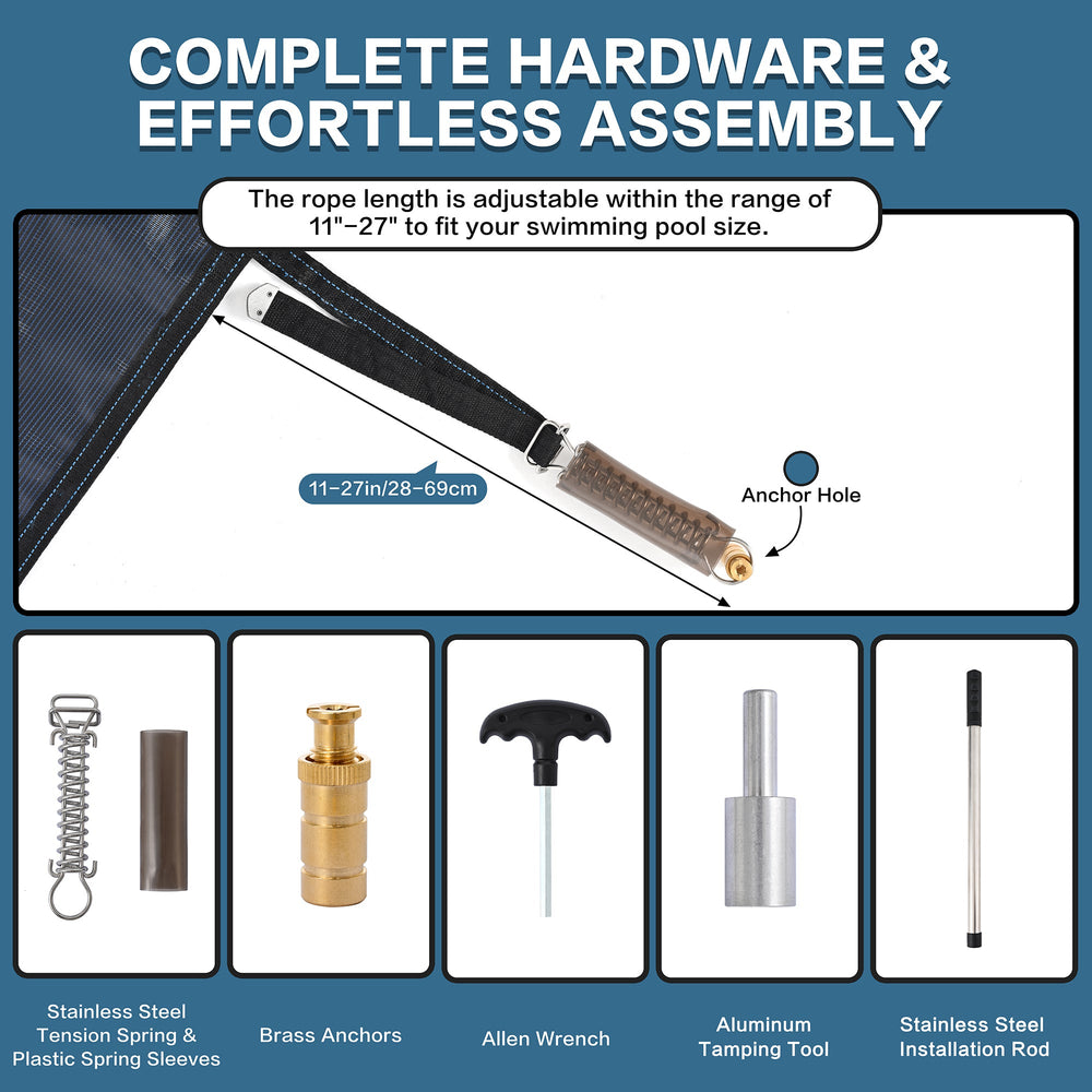 - All accessories are ready to use out of the box: This kit includes brass anchor bolts, stainless steel springs and all necessary installation tools. Compatible with hard pool banks such as concrete and stone, adjustable rope length, suitable for 90% of underground swimming pool structures. The three-step installation method of 'measurement - drilling - tensioning' can be completed by a single person.