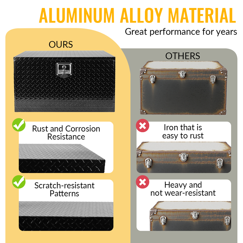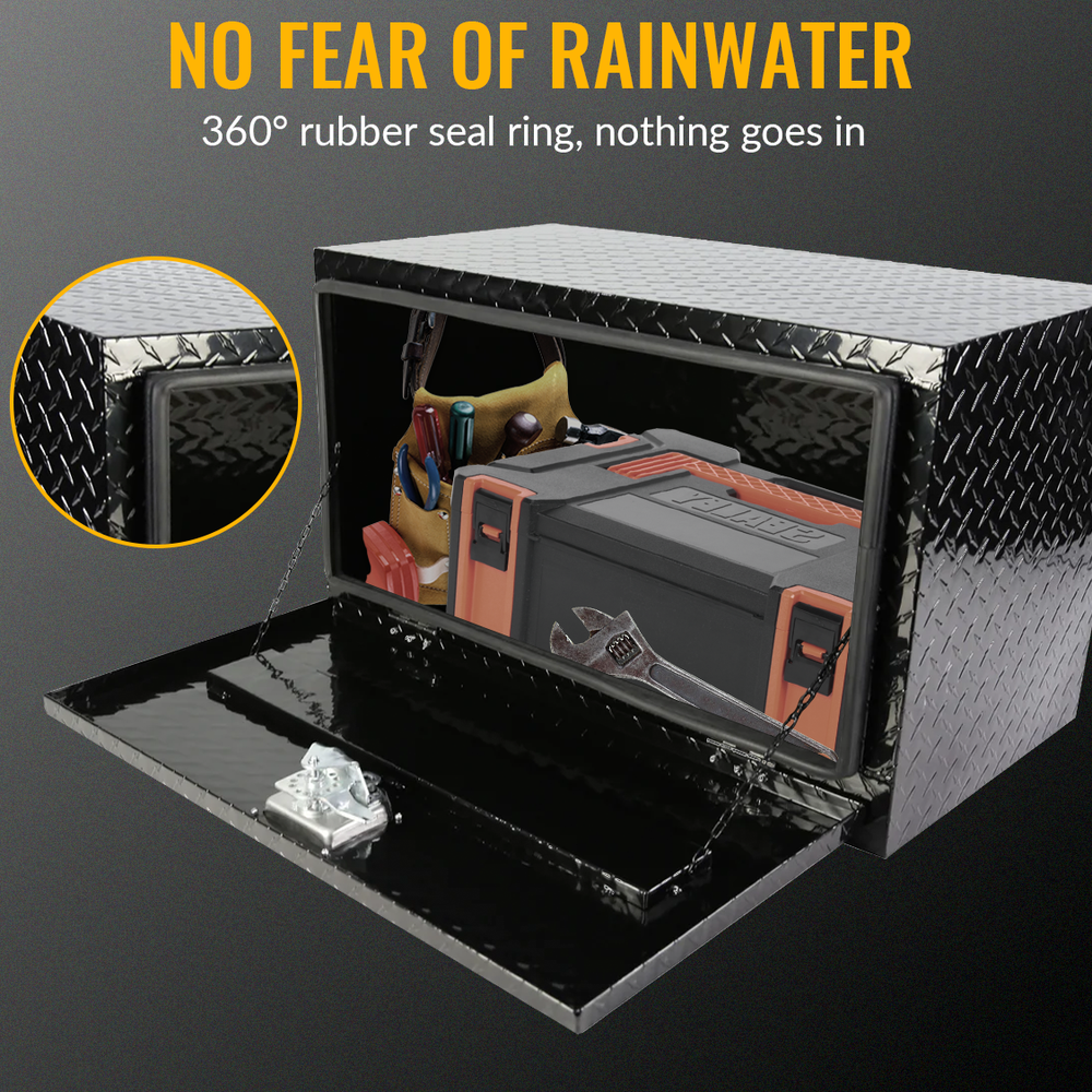 - Secure and Protective: A stainless steel latch keeps your tools and supplies secure, protecting against theft and weather elements. A weather guard rubber seal prevents moisture or water from seeping through, ensuring your tools stay dry.