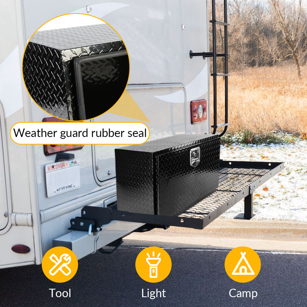 - Perfect Tool Cabinet for Anywhere: This tool box can be mounted on a hitch rack, cargo rack of your camper, perfect for the tongue of your enclosed trailer, suitable to be installed on the rear of your RV for extra storage. Widely used: From snow and ice equipment to toolboxes, hydraulics, towing, truck, trailer hardware and Stage sound box storage.