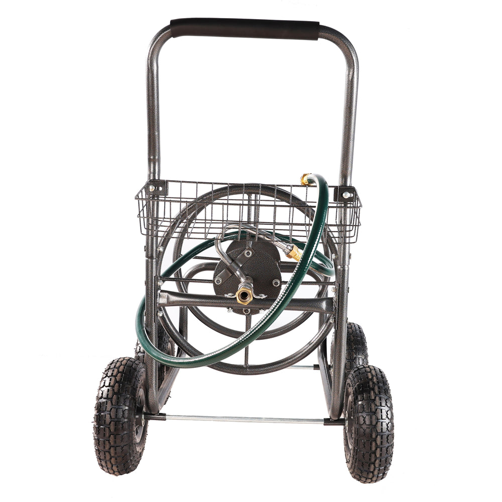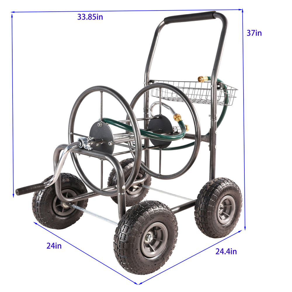 4 Wheels Portable Water Hose Reel Cart with Storage Basket Heavy Duty Steel