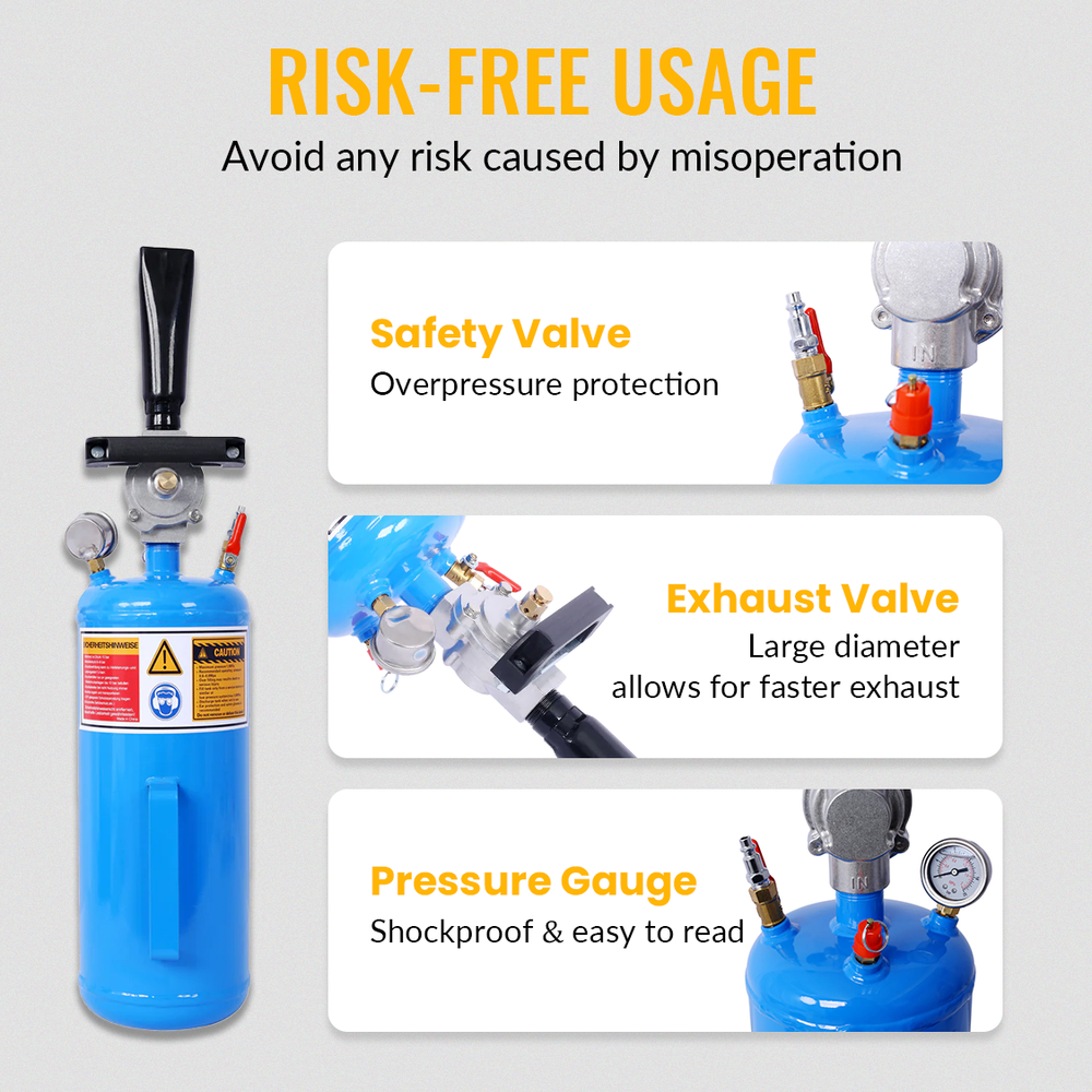 • Safety Features: Prioritizing safety, our bead blaster tire inflator includes a built-in safety valve that automatically relieves pressure above 115-120 psi, preventing over-inflation accidents. The gauge also features shock-proof damping liquid to reduce numerical deviations, allowing you to monitor and adjust tank pressure accurately.