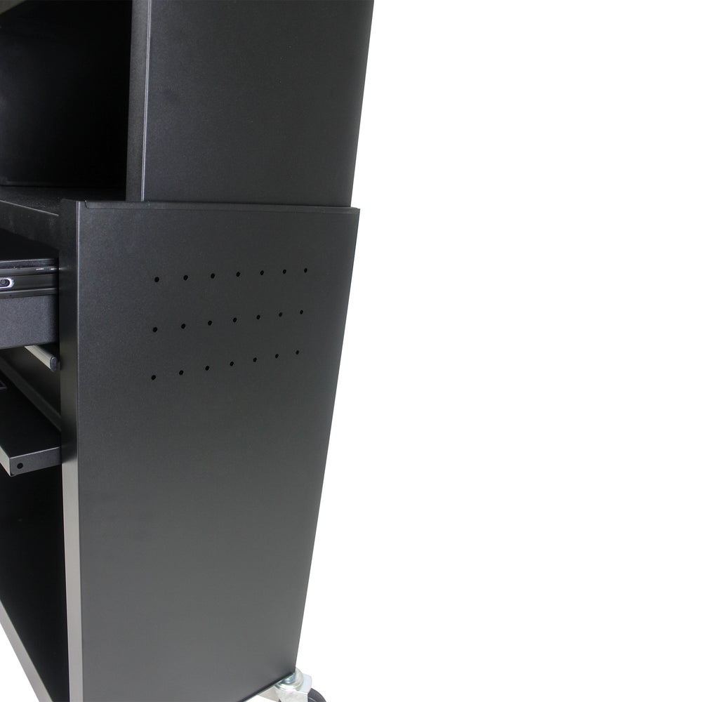 - The metal storage cabinet comes with four wheels, two of which have parking brakes, so you can move the cabinet around freely or park in one place.