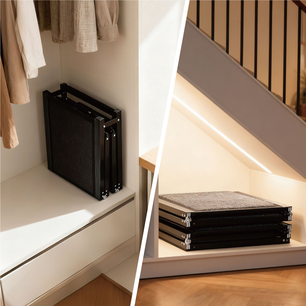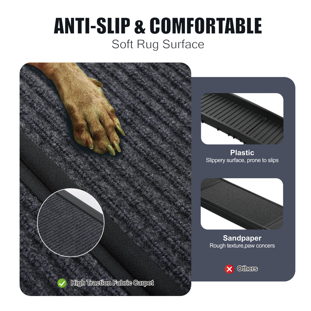 - 【 Anti-slip & Comfortable Dog Ramp 】Our folding dog ramp features a non-slip gray carpet surface, it is made of dense anti-tear plastic fibers with Loofah-like texture grip, provides plenty of traction, and absorbs the impact as the dog steps on, relieves the pressure on the paws and joints and reduce the pet's muscle ache and joint tension caused by jumping. The top of each step has an anti-slip rubber-like surface, which ensure that your pet will not slip while walking in any weather condition
