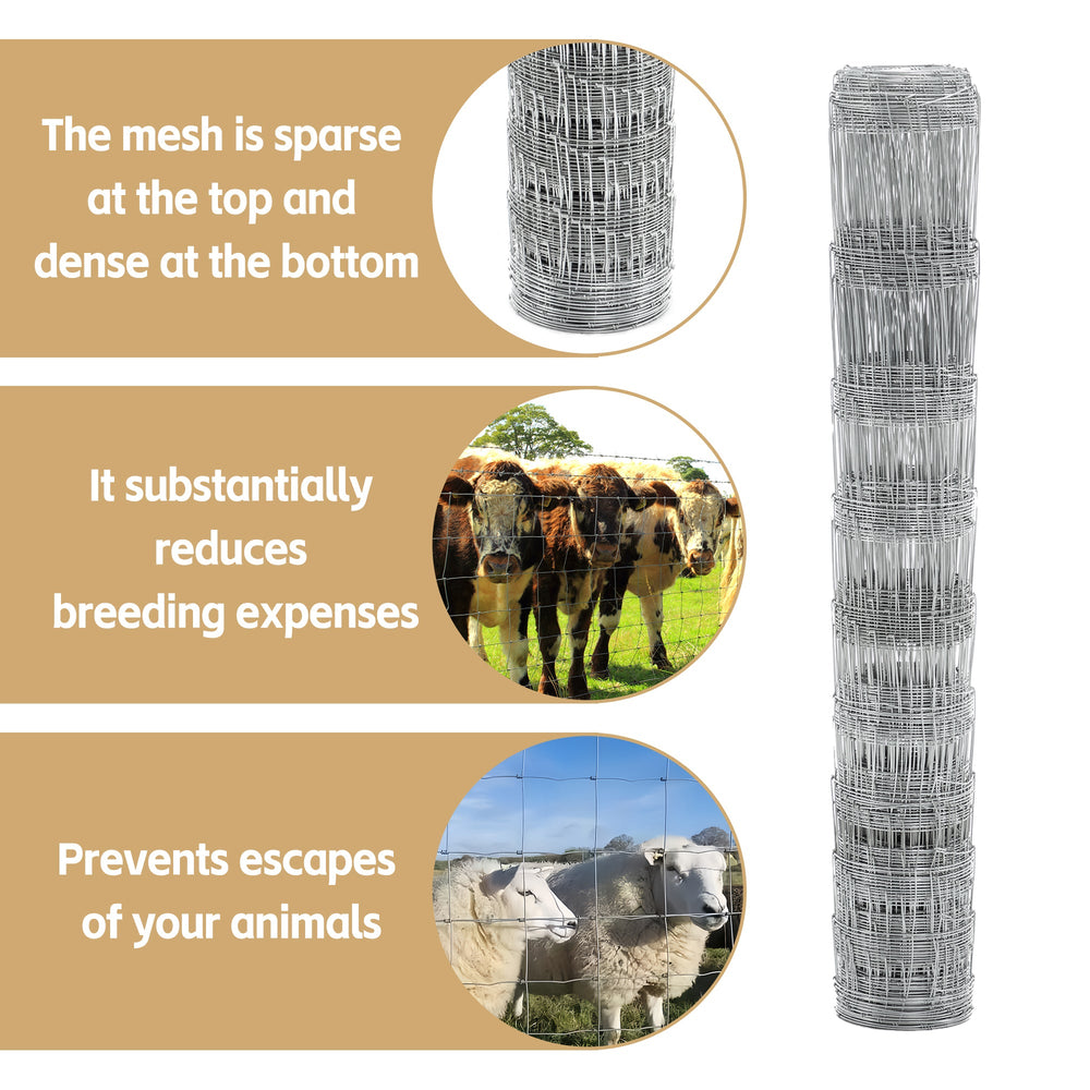 • Material duradero: La cerca para granja está fabricada con alambre de acero de alta calidad con un diámetro de 0,078 pulgadas y cuenta con una superficie galvanizada por inmersión en caliente, lo que garantiza una larga duración. Esta robusta construcción está diseñada para soportar condiciones climáticas adversas, lo que la convierte en una opción confiable para un uso prolongado.