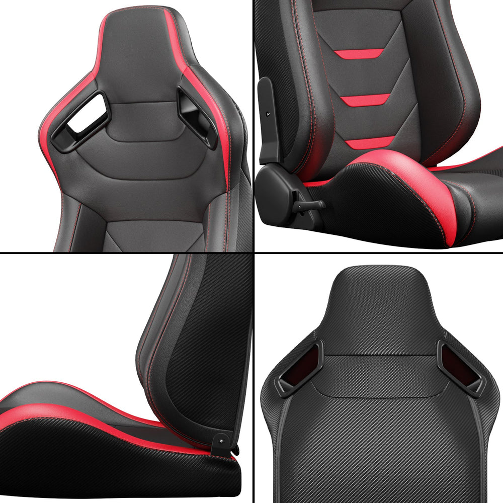 2pcs asientos de carreras universales de cubo rojo puntada roja de cuero rojo de cuero reclinable de cuero de cuero con deslizador de ajustador (sin incluir el soporte del asiento)