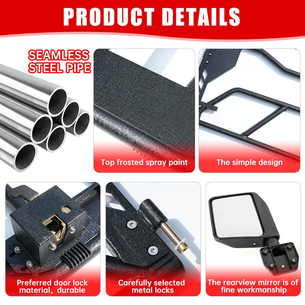 - Compatibilidad: Puertas de media hoja de tubo de acero con espejo retrovisor para Jeep Wrangler JL JLU y Gladiator JT de 4 puertas (incluido el modelo 4XE) de 2018 a 2024. No son compatibles con el modelo Jeep Wrangler JK.