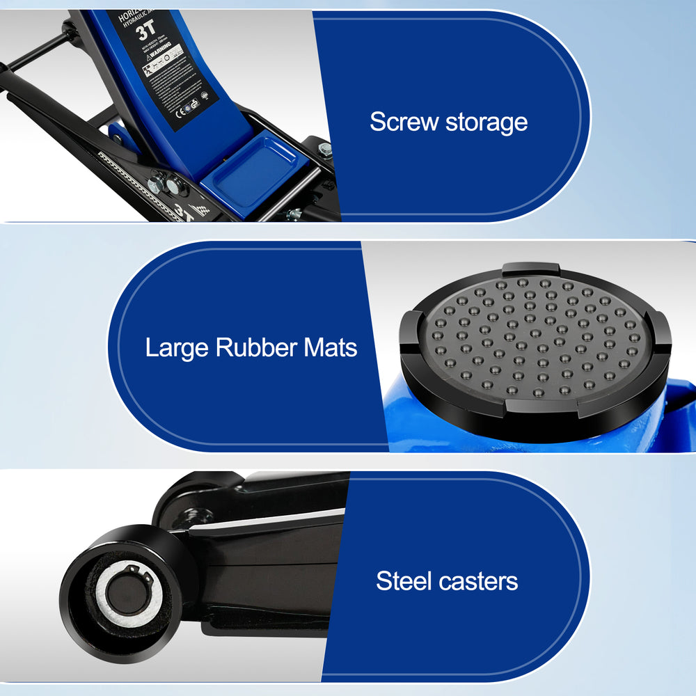 3 ton 6600 lbs vloerkrik met laag profiel, dubbele zuiger, snelhefpomp, hefbereik 75 mm / 2,95 "-500 mm / 19,69" - blauw
