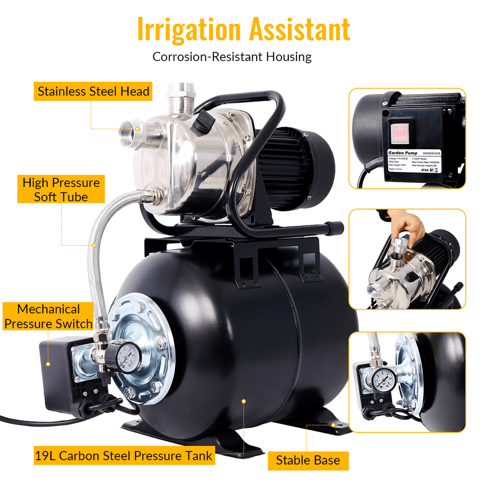 1.6HP Shallow Well Pump with Pressure Tank Garden Water Pump Irrigation Pump Automatic Stainless Steel Head