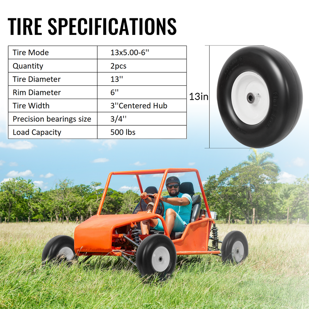2PCS 13x5.00-6" Flat Free Lawn Mower Tires Smooth Tread 3/4" Bearing 3" Central Hub 500 LB Capacity per pc.