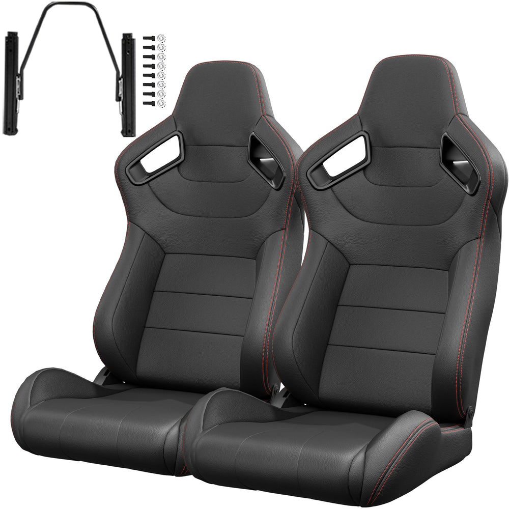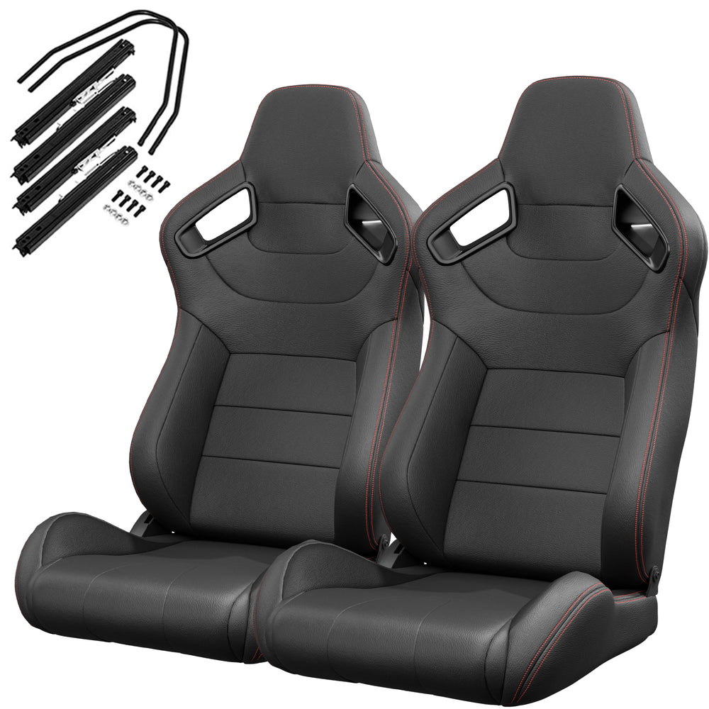 2PCS New Universal Bucket Racing Seats Red Stitch PVC Leather Reclinable Carbon Look Leather Back With Adjustor Slider(Not Including Seat Bracket)