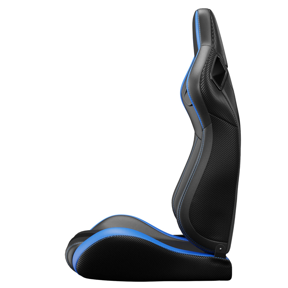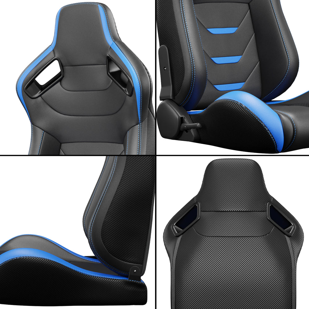 2PCS Universal Bucket Racing Seats Blue Stitch Blue PVC Leather Reclinable Carbon Look Leather Back With Adjustor Slider(Not Including Seat Bracket)