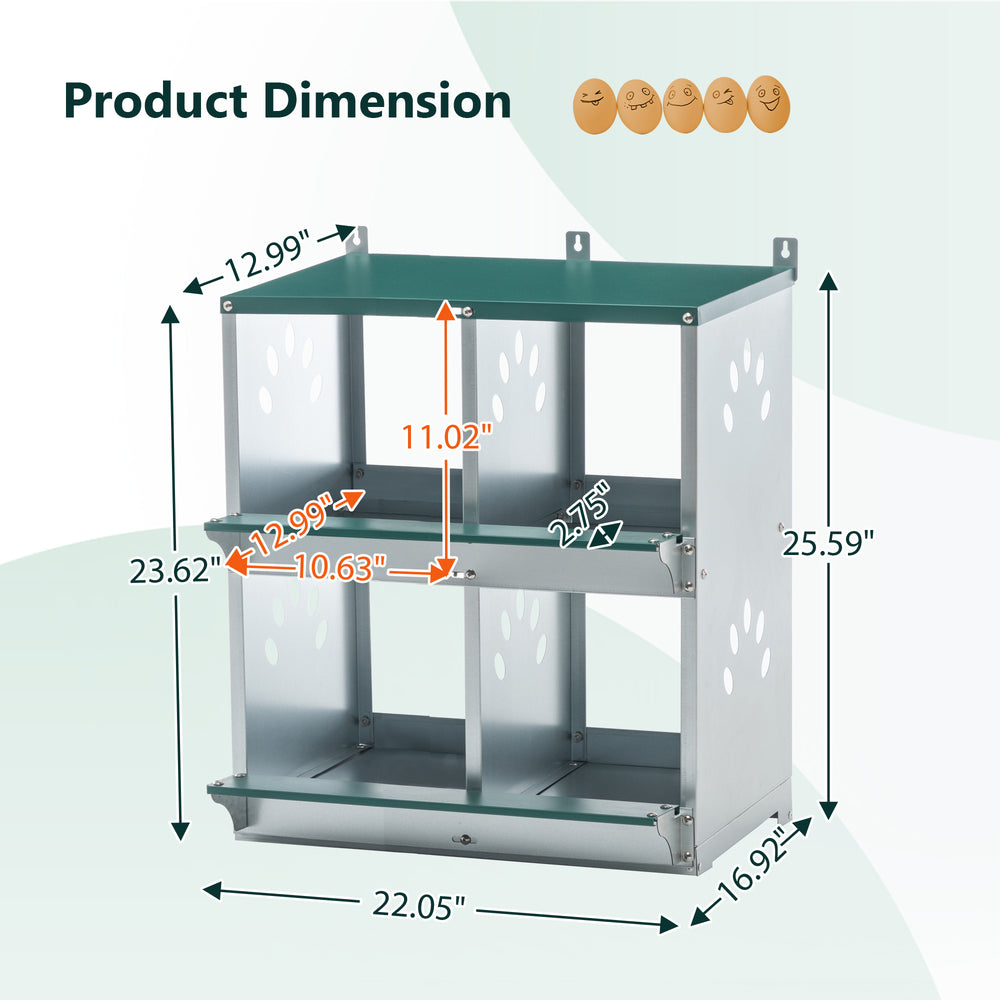 - The nest box is 22.05 inches long, 16.92 inches wide, and 25.59 inches high. Each chicken coop has 4 compartments, providing ample room for movement, providing a comfortable, safe, and sheltered space for the hens to stay safe and secure, thereby promoting continuous egg production.