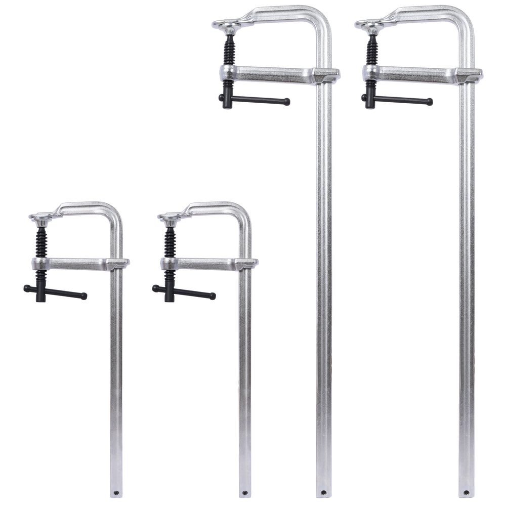 - The F-clamp is expertly crafted from drop-forged 40 Cr alloy steel, offering exceptional strength and resilience. This high-quality construction ensures outstanding durability, making it the ideal tool for heavy-duty woodworking and metalworking projects. Max jaw opening: 2 pcs 12 inch Throat depth: 3"/80mm and 2pcs 24inch ,Throat depth: 4 3/4"/120mm; Clamping force: 1400 lbs.