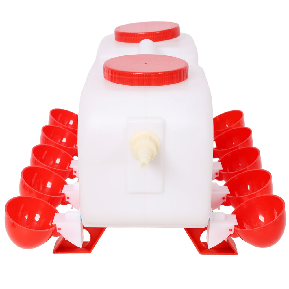 - This practical poultry waterer boasts a generous 2.5-gallon capacity to hold an ample supply of fresh, clean water. Each water bucket is equipped with 10 durable water cups, each featuring a convenient 2.5-inch diameter that’s ideal for chickens to drink from comfortably, preventing spills and minimizing water waste. These cups are distributed evenly on both sides of the bucket. Designed to efficiently cater to small to medium flocks, this setup can reliably provide water for up to 10 chickens.