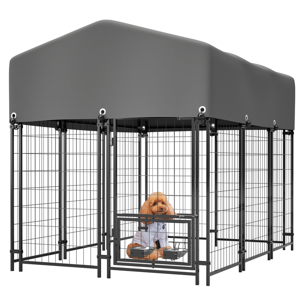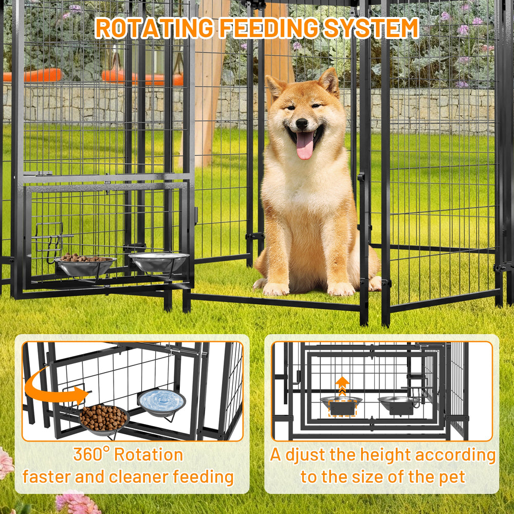 Dog Kennel Outdoor with Roof 4.23'x5.82'x4.83' Welded Wire Enclosure Heavy Duty Dog Crate with UV-Resistant Waterproof Cover Double Lock & Rotating Feeder