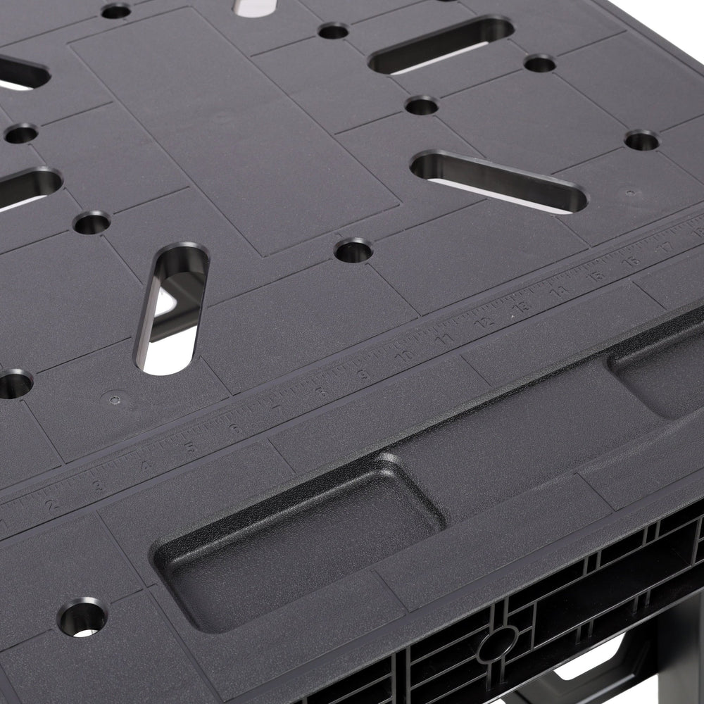 - This workbench is equipped with versatile multi-functional holes, X-shaped grooves, and quick-reference measurement markings, creating a streamlined workspace for enhanced efficiency. The strategically placed holes and grooves enable seamless clamping of workpieces, while the integrated measurement markings eliminate the need for separate tools, making measuring and aligning tasks quick and intuitive.