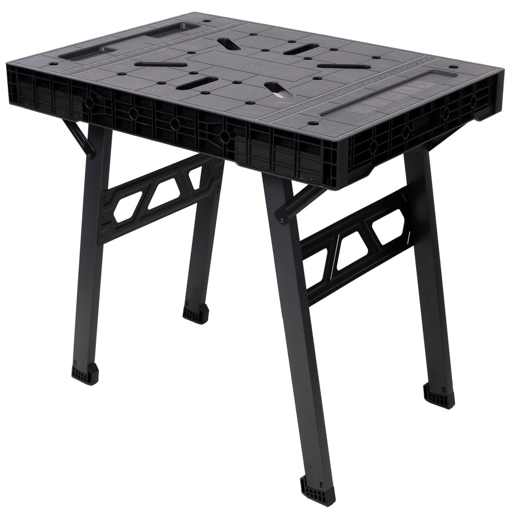 - This workbench features an innovative foldable design, allowing for effortless setup and storage. With a quick 3-second unfold/fold mechanism, it transforms from a compact unit to a functional workspace in an instant. When folded, its sleek profile measures just 3.5 inches in height, making it an ideal space-saving solution for garages, workshops, or small storage areas.