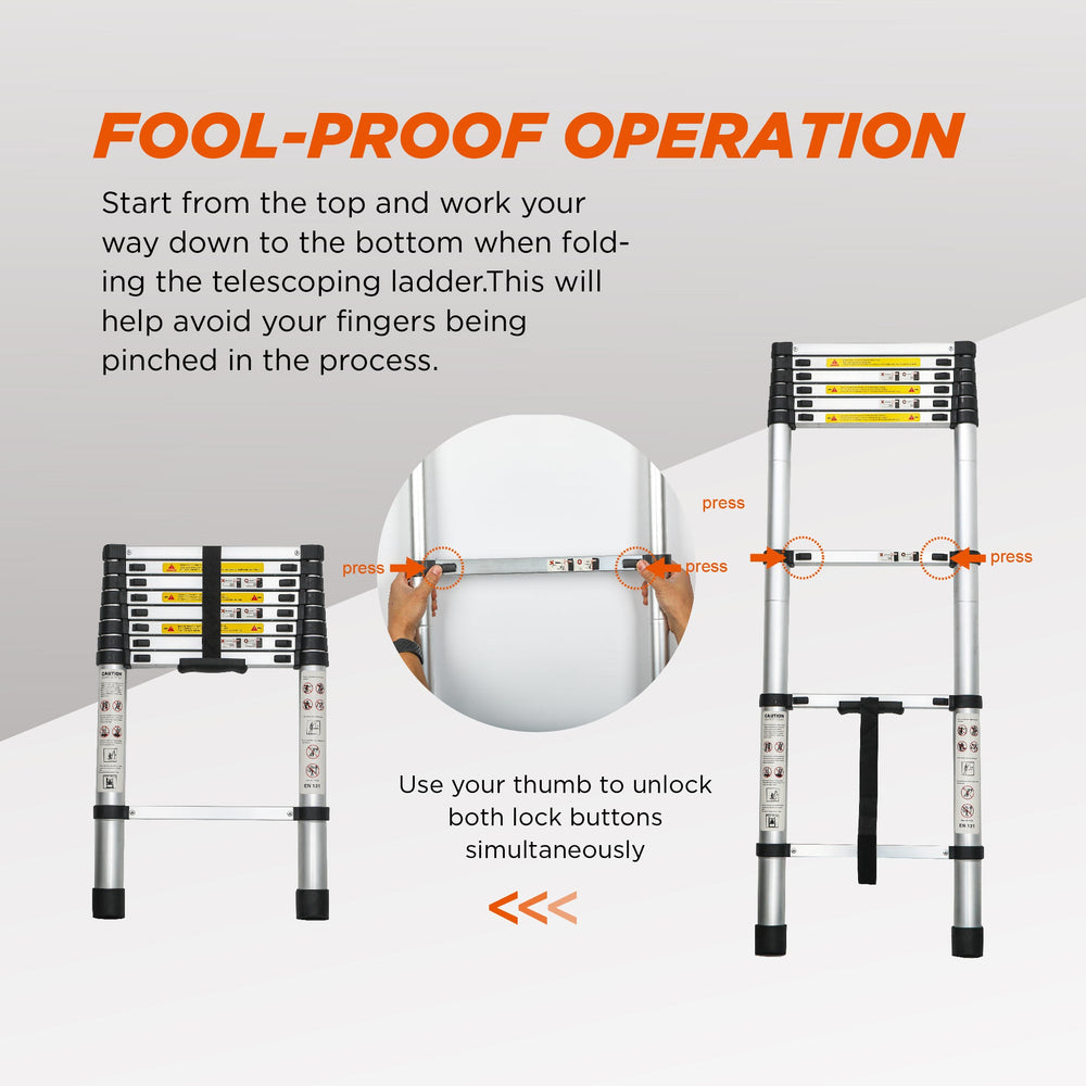 - 【Locking Mechanism】 - The independent locking mechanism allows the aluminum 8.5FT telescoping ladder to be locked at every step. Using the inward sliding latch, you can gradually adjust the stepping in units of one foot to easily reach and retract any desired height. (Pls take care your fingers when retract the ladder. Dont put your thumb between the ladder.)